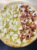 Mozzarella cheese & ricotta cheese topped with fresh garlic, ham, pineapple & bacon.